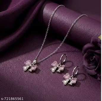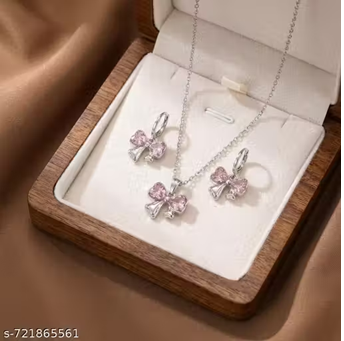Elevate your every day look with this adorable Silver Plated Bow Knot Jewellery Set. Featuring a delicate ribbon design embedded with sparkling pink American Diamonds (AD) stones, this set exudes a modern, feminine charm. Perfect for girls and women who love minimalistic and Korean-style fashion. Whether your dressing up for a date, office, or a casual outing, this necklace and earring combo adds the perfect touch of elegance. ideal gift for birthday Gift, anniversaries Gift, Valentine’s Day Gift, or for a best friend/sister. Occasion: Suitable for daily wear, office wear, college, and casual parties. Silver Earring, Korean Necklace, Moon Earring, Star Earring, Aesthetic Jewelry, Gifts for Girlfriend, Simplee Chain, AD Jewellery, Minimalistic Earring, Party Wear Accessories.